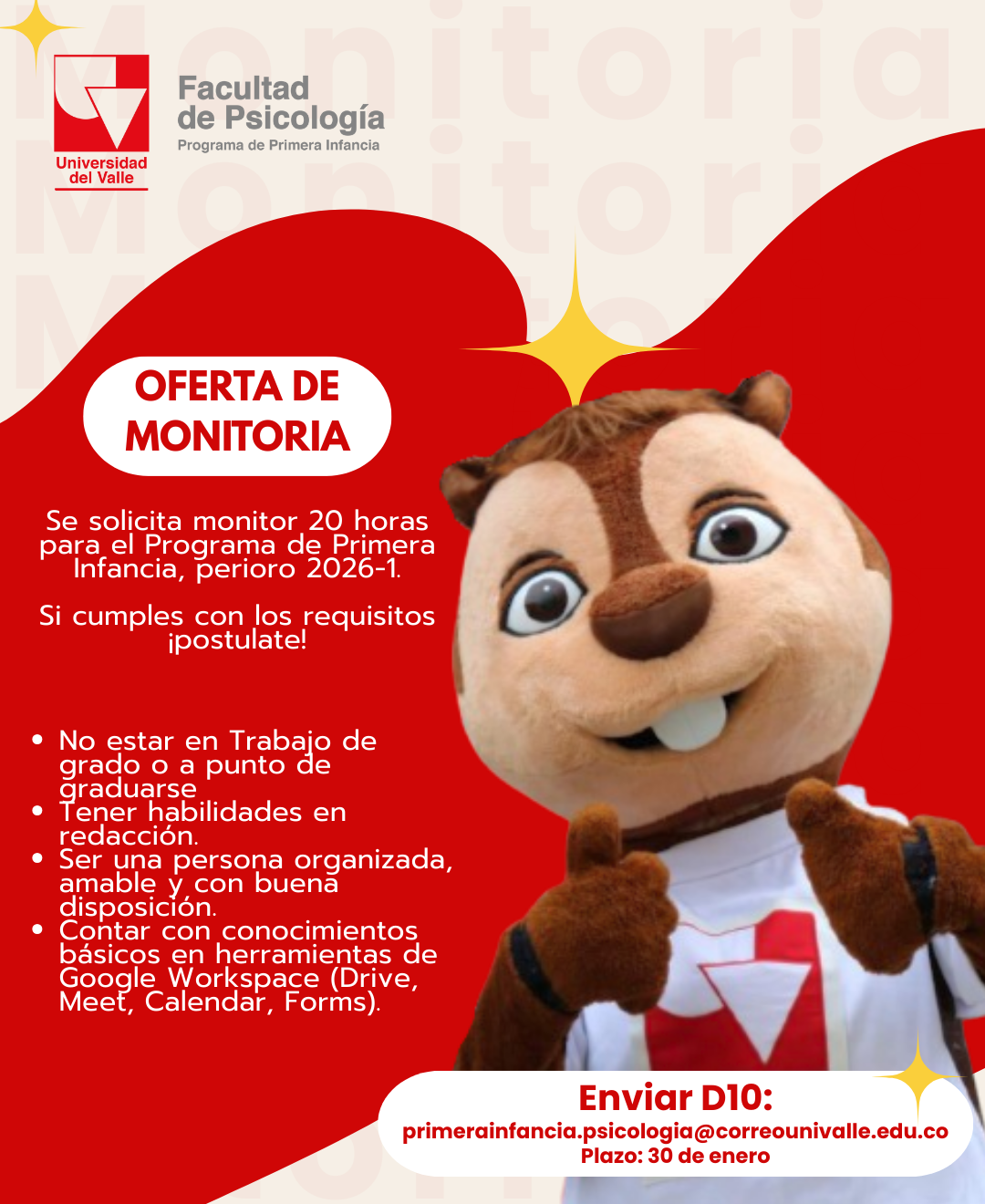 La Facultad de Psicología invita a la comunidad universitaria a postularse a la monitoria académica (20 horas) para el Programa de Primera Infancia, periodo 2026-1.