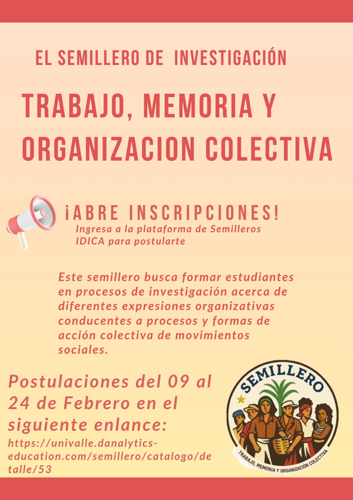 El Semillero de Investigación Trabajo, Memoria y Organización Colectiva abre su convocatoria para estudiantes de cualquier programa de pregrado de la Universidad del Valle interesados en formarse en procesos de investigación social.