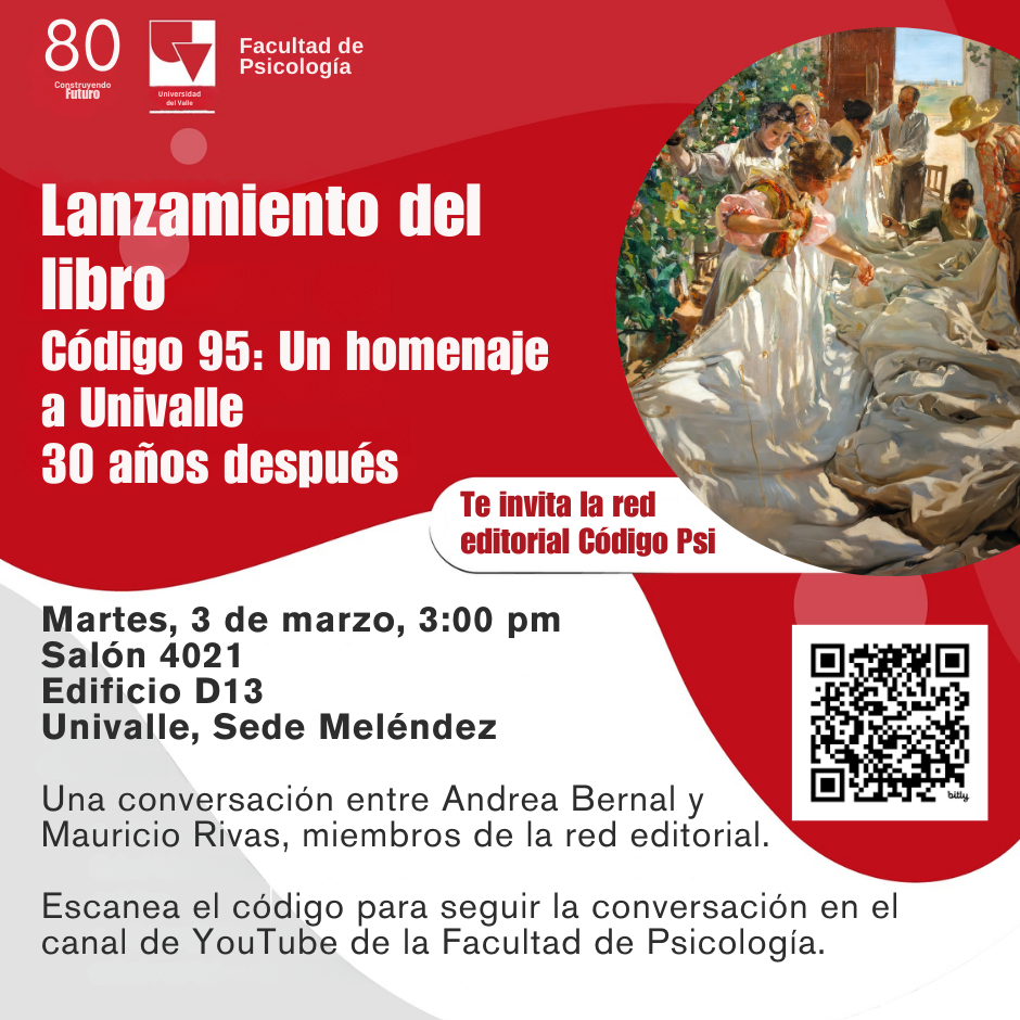 La Facultad de Psicología de la Universidad del Valle invita a la comunidad académica y al público en general al lanzamiento del libro Código 95: Un homenaje a Univalle, 30 años después, una obra que recoge reflexiones y memorias en torno a un momento clave para nuestra historia institucional.