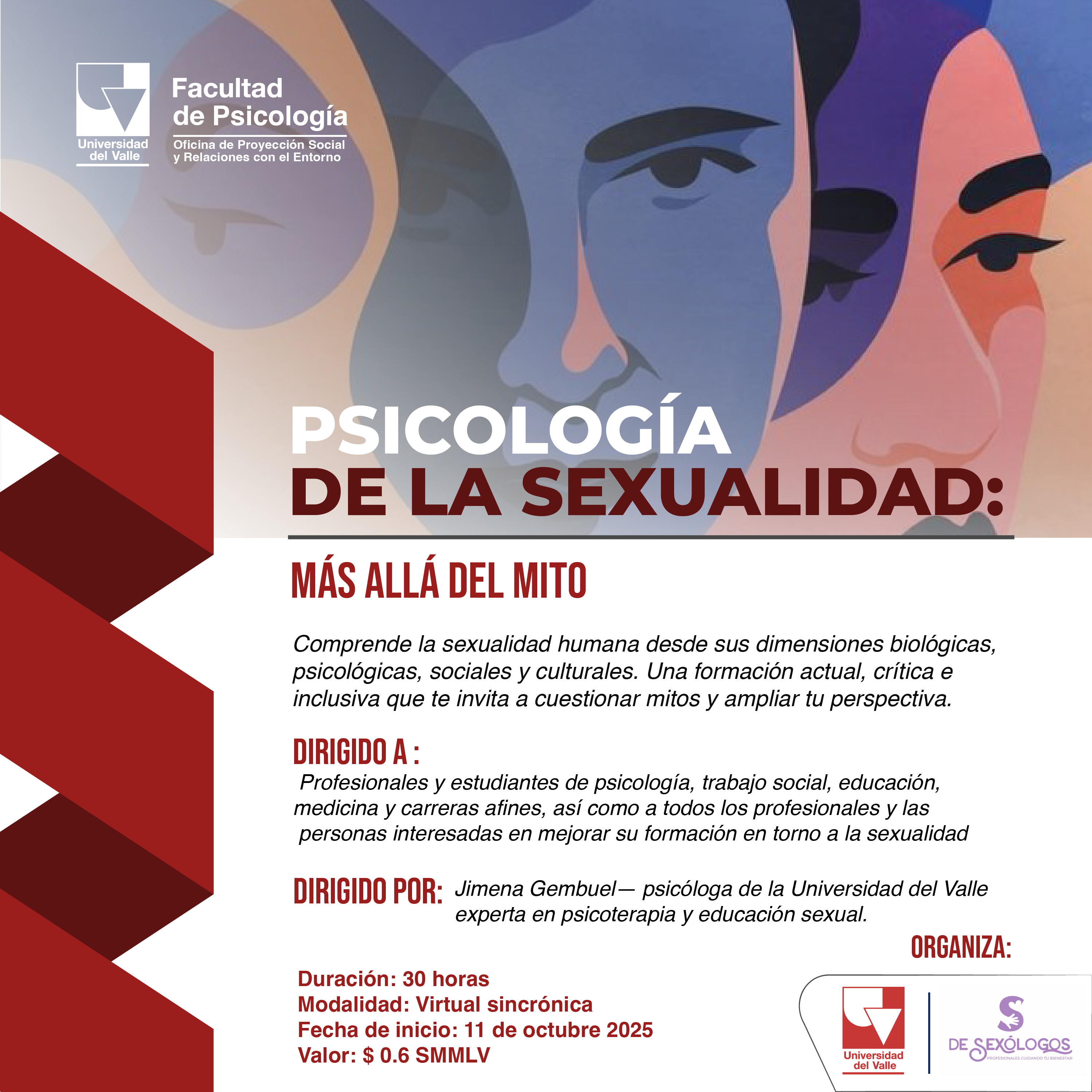La Facultad de Psicología de la Universidad del Valle, en alianza con S de Sexólogos, abre las inscripciones para el Curso de Psicología de la Sexualidad, un espacio académico diseñado para ampliar la comprensión de la sexualidad humana desde un enfoque psicológico, crítico y basado en evidencia científica. Este programa de formación continua ofrece herramientas teóricas y prácticas para analizar la sexualidad desde una perspectiva integral, cuestionar estereotipos y fortalecer la intervención profesional con sensibilidad, respeto por la diversidad y enfoque de género.